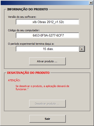 Ser-lhe-á apresentado o quadro ''INFORMAÇÃO DO PRODUTO'' , onde é mostrada a versão do software, o código do seu computador e o tempo de utilização restante.