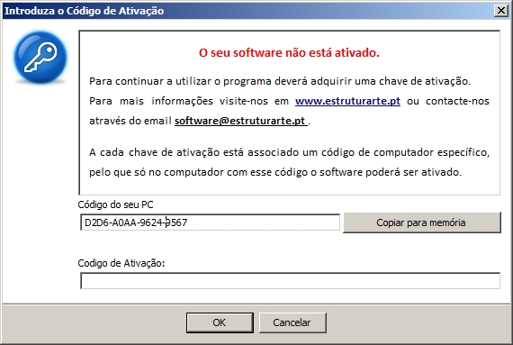 No caso da aplicação ainda não estar ativada, deverá enviar-nos por email o código do PC, de modo a permitir que lhe seja enviado o código de ativação correspondente.